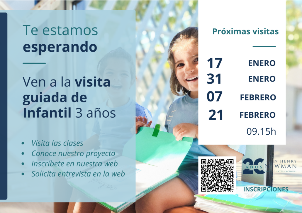 Os invitamos a las diferentes visitas guiadas para Infantil 3 años que realizaremos los días 23 de enero, 13 de febrero y 27 de febrero a las 09.15h en el Colegio Internacional J.H. Newman de manera presencial. En ellas, contaremos cuál es nuestro proyecto educativo, cómo trabajamos en el aula y podréis ver de primera mano el día a día de los alumnos.