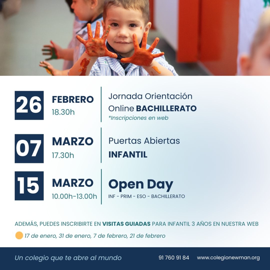 Celebramos una Jornada de Puertas Abiertas exclusiva para toda la etapa de Infantil el viernes 7 de marzo a las 17.30h. Todas las familias interesadas en el proyecto de la etapa de Infantil Newman (3 años, 4 años y 5 años) podrán hacer un recorrido por todas las aulas, espacios, conocer la metodología, hablar con los profesores y tutores y mucho más. ¡No os lo podéis perder!